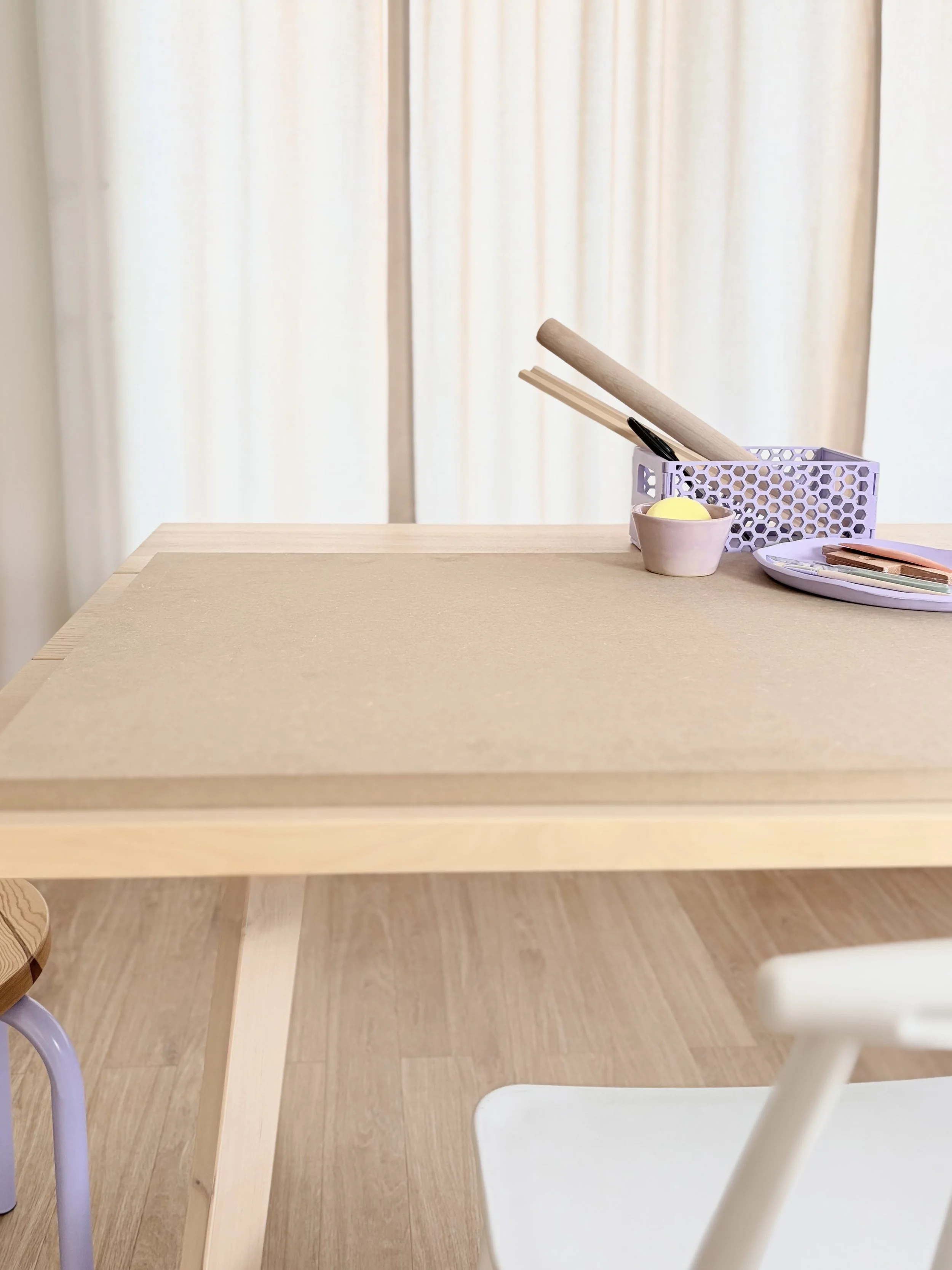 Your rolling, building, and drying surface. At least 60 Γ 90 cm, 18 mm thick. MDF, plywood, or solid wood all work. Any hardware store will cut it to size. We wouldn't want to work without it anymore β but a piece of canvas or an old kitchen towel works as well!