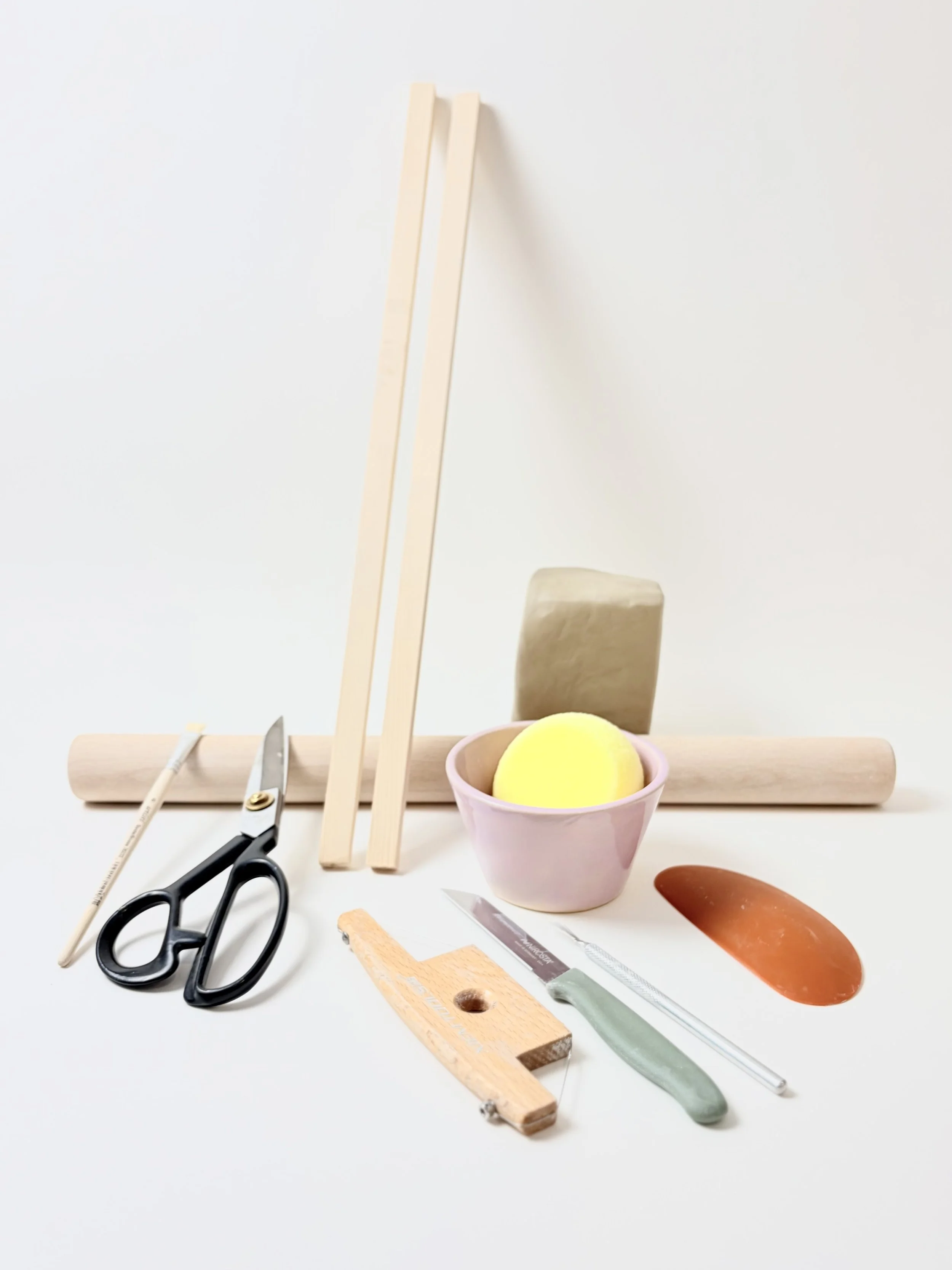 The star of the show. Stoneware with a little grog is ideal for slab building (20-40% fine grog), low or mid firing temperature. This works with most firing services, so you're covered wherever you fire. Going kiln-free? Air-dry clay works great for flat projects. Find it at your local pottery supplier or a good art supply store.
