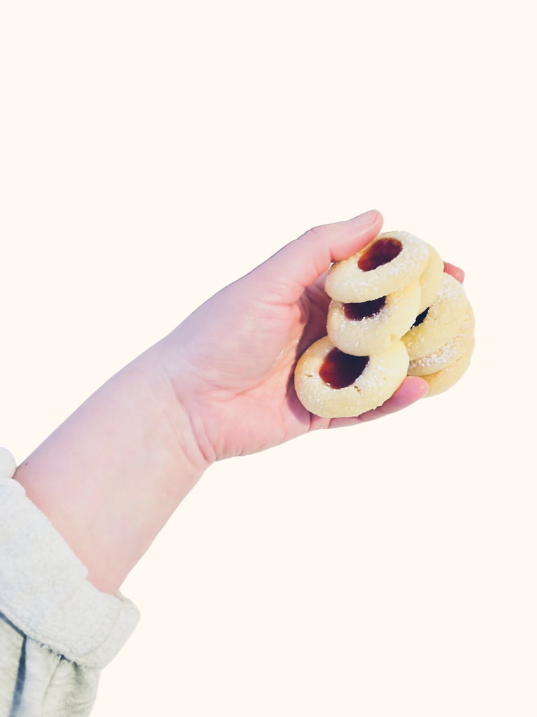 Soft, buttery, with a little jam crater in the middle β these cookies are what Sunday mornings are made for. We make them while waiting for pieces to dry. Come on and join us!